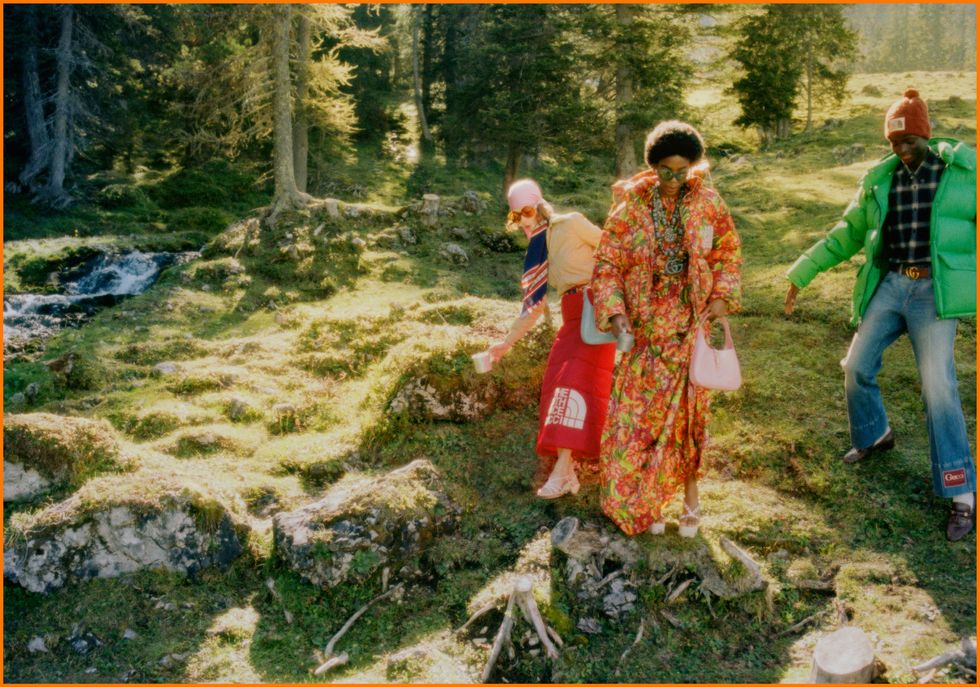 Now back to Gucci. By now, we’ve all seen the slightly-absurd-but-kind-of-genius collaboration between the American outdoor clothing company The North Face and Gucci. The partnership is said to be “a celebration of the spirit of discovery, exploring deeper parallels between the two brands in equipping those who seek adventure through challenging the status quo and a quest for self-expression.” It’s the impracticability that’s attractive and exciting for me—a group of models looking at a map on a hiking trail, two of them wearing heels and holding handbags. It’s this kind of unworkability of the framed moment that inspires some sense of delight in me. On the back of this project, Gucci (through its sustainability platform Gucci Equilibrium) introduced a series of collaborations with three thinkers and makers—visual researcher and artist Theophilus Imani, curator of a black history of art Alayo Akinkugbe and founder of blackarchives, Renata Cherlise. These collaborations come at a critical moment of reckoning with the representation of the Black figure in art. Imani, Akinkugbe and Cherlise’s work in this field is important and deserves space, consideration and engagement. And yes the argument is that with this reach, Gucci is broadening their scope and allowing the conversation to resound farther. However, there is also a point to be made for the dominant culture’s insatiable hunger for what is “trendy”, “edgy” and relevant.
