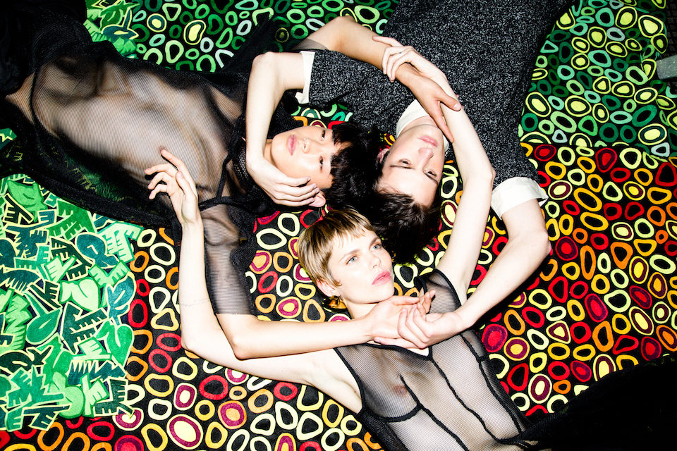 Conceiving the concept for the campaign during their design implementation, connections were drawn between the collection silhouettes and prints, and the kind of work that SMAC gallery artists produce. The campaign was photographed at SMAC gallery and takes a look at the relationship between three friends/lovers who have been locked inside the gallery over night. A strong sense of intimacy was captured between the three models by photographer Neil Roberts. The intimacy needed in the photographs were accomplished with ease which might be attributed to the models familiarity with one another due to working together on previous AKJP brand campaigns. The faces of the campaign are Jae Kim who has worked with AKJP from the age of fifteen, AKJP campaign and runway darling, Nina Milner as well as Daniel Defty.
