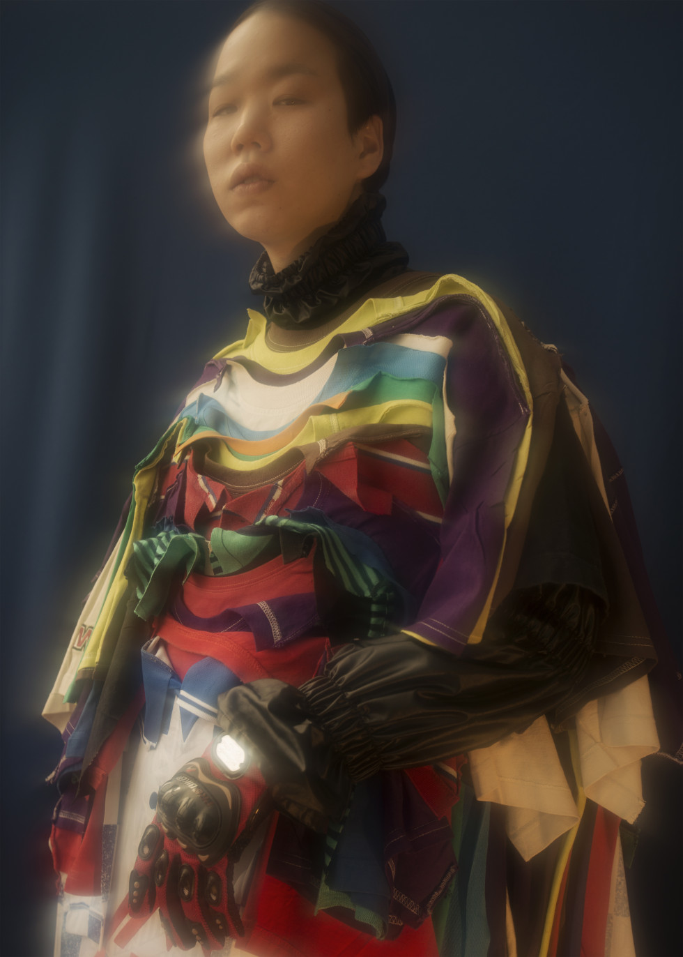 After starting off at Central Saint Martins studying womenswear print, GOOM designer Goom Heo reevaluated her position and felt the need to click pause. Being completely open about the fast-paced fashion lifestyle and the pressure that can come from being pushed into spaces that one is not ready for, Goom turned down potential placements with brands such as Dior, Kenzo and Margiela for a two year sabbatical from the industry, and went back home to Korea. However, she never stopped taking in the life she saw on the streets, and armed with her camera, she documented the trash that she found around Korea and China. Goom remembers one distinct moment, seeing a man roll up his t-shirt to expose his large belly, and no one around him being concerned about this. For her this represents her decision to go back to CSM as well as the premise behind her final collection; not being concerned about what other people think and taking ownership of one’s fashion choices.