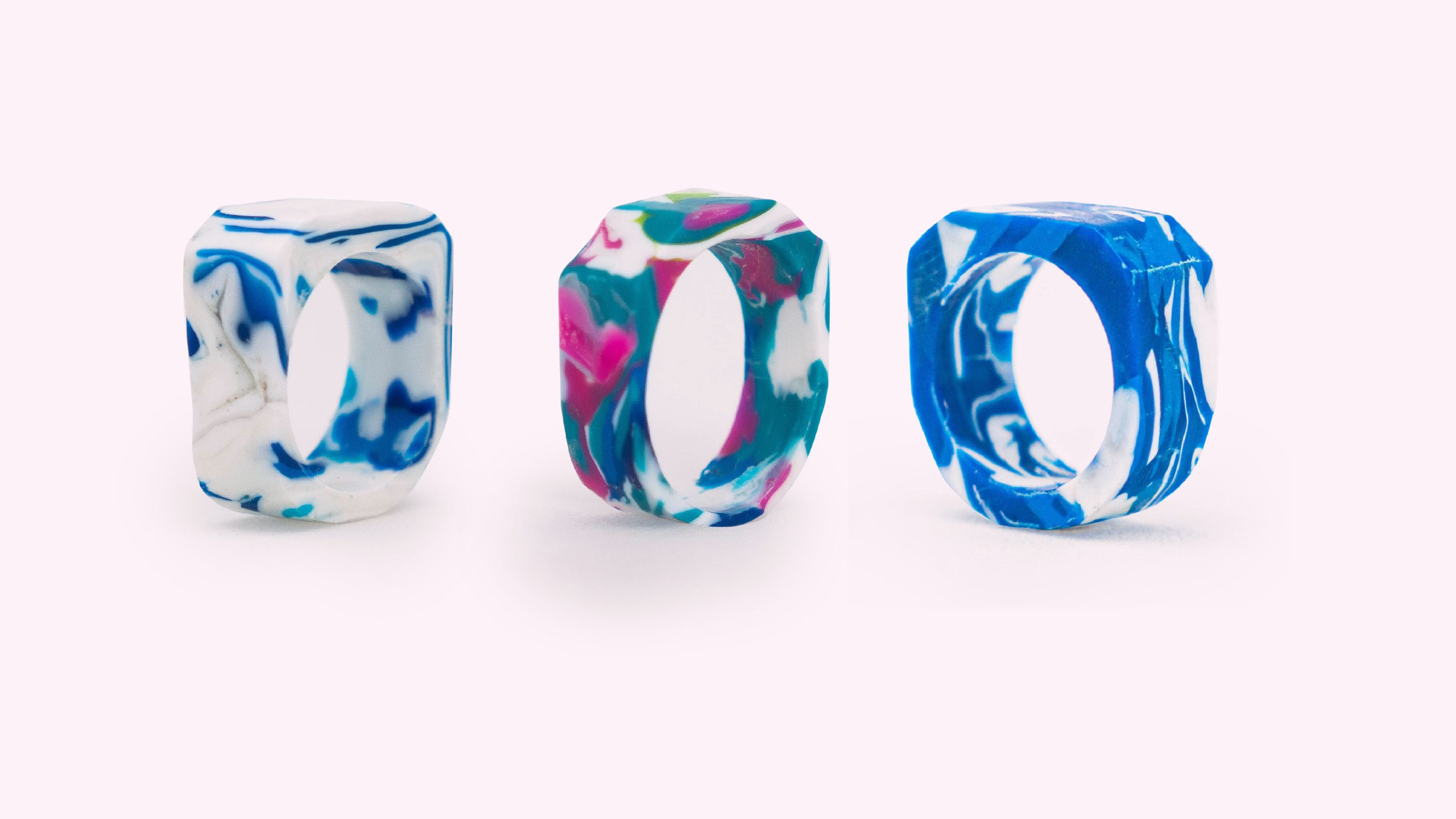 These hand-made, marbled HDPE rings have emerged from the archive with the process and product a bit more polished and ready for the world. An attempt to valorise a material and process sometimes seen as cheap or unnecessary by some serves as a reminder of what where we place value and our consumption while aligning engagement with these ideas with the potential and beauty hidden in things we consider waste. There is something provocative about remanufacturing such a cheap, mass-manufactured and destructive material into something unique, delicate and beautiful.