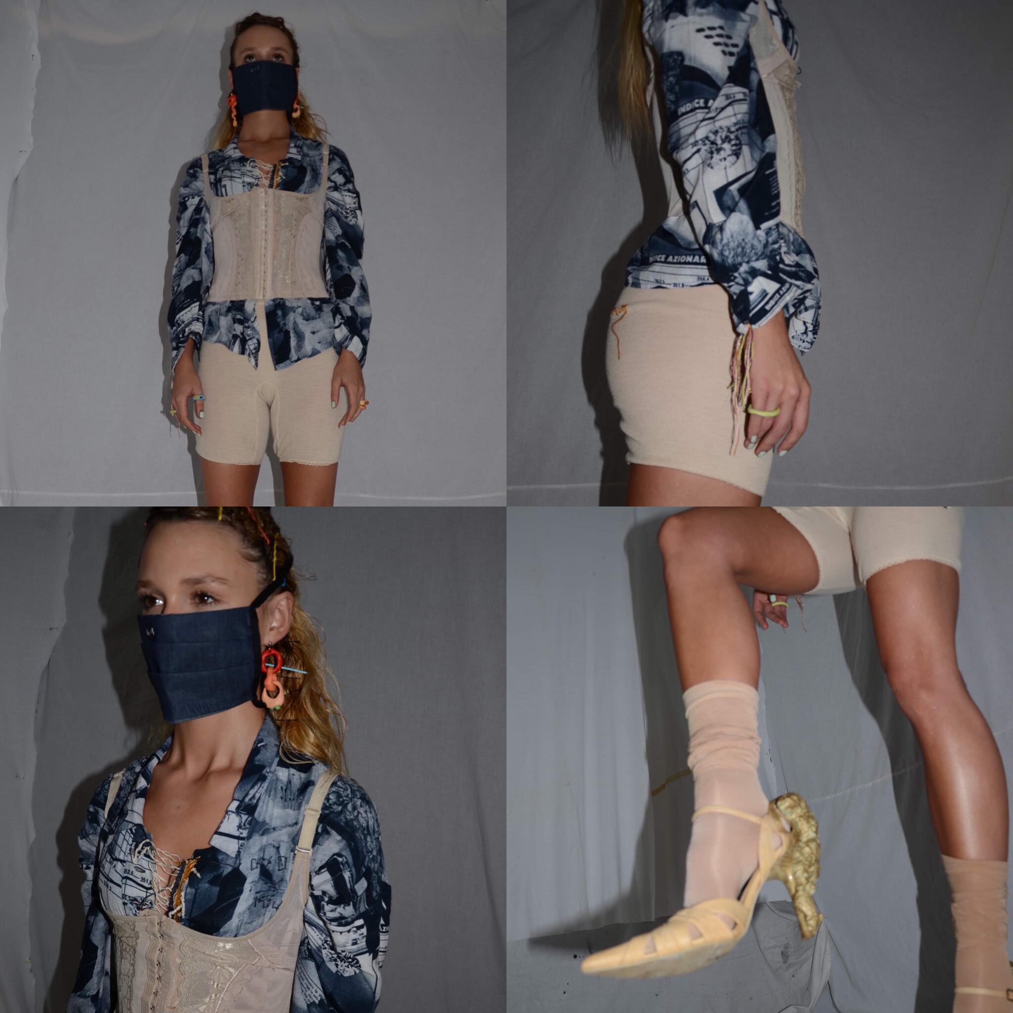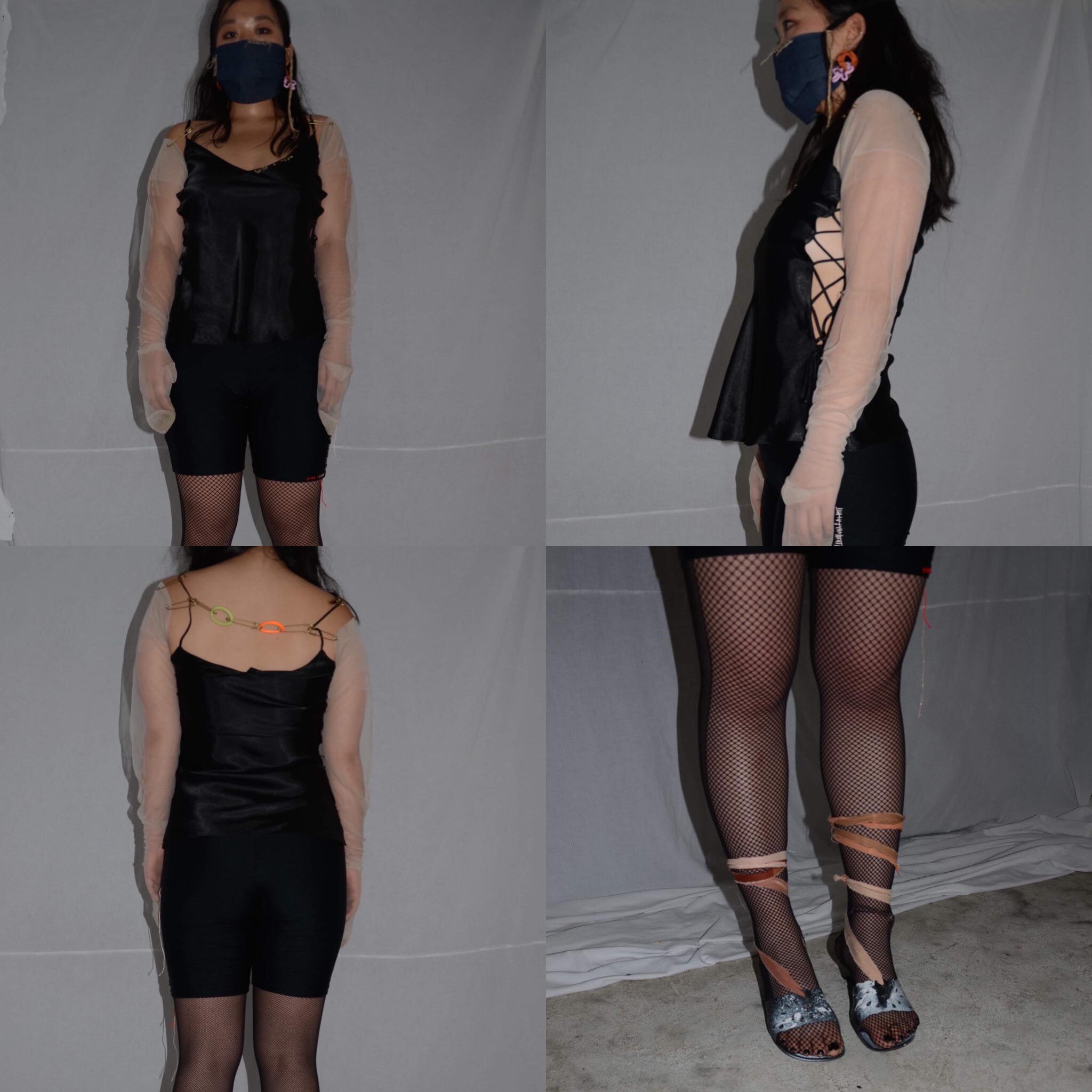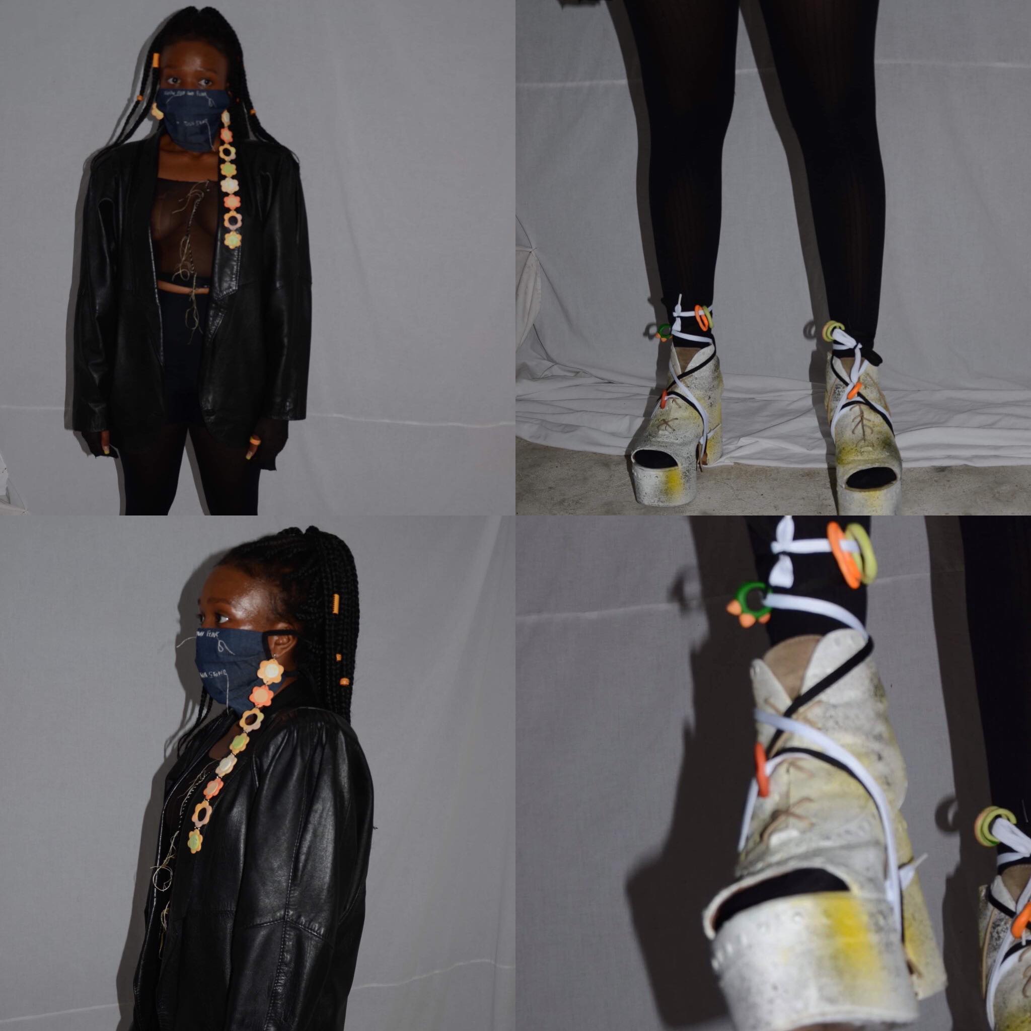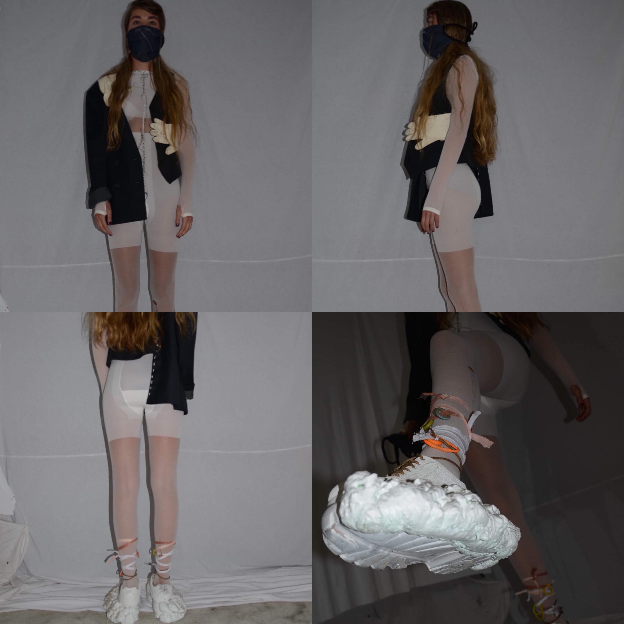 Liza: Vintage gloves, embroidery with thread from charity shops, different textures, knitwear, net, mesh, etc. Different types of stockings up-cycled to body-con crop tops, rough stitching, showing the hemming of clothing and expanding foam on the shoes.