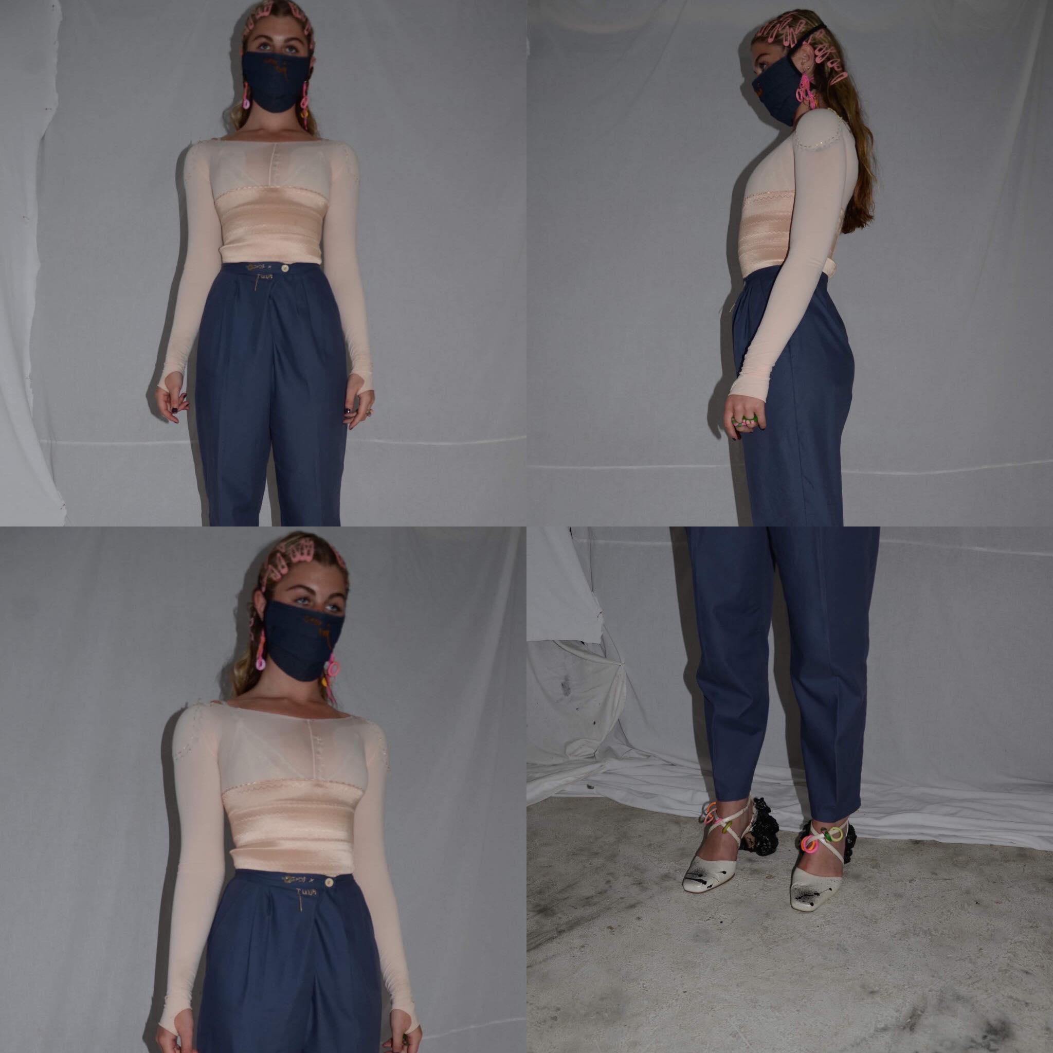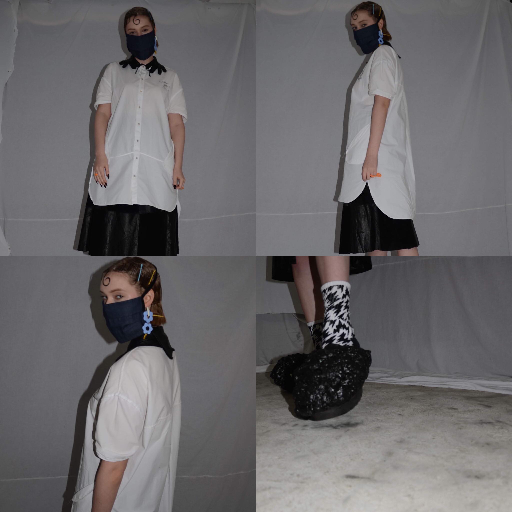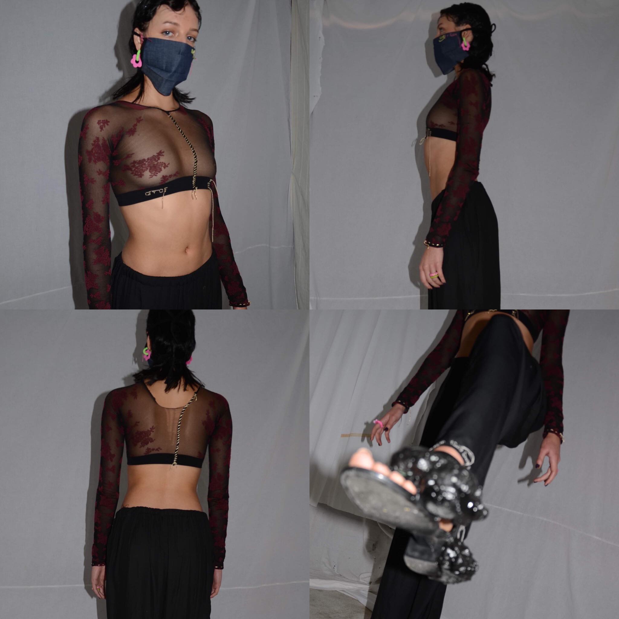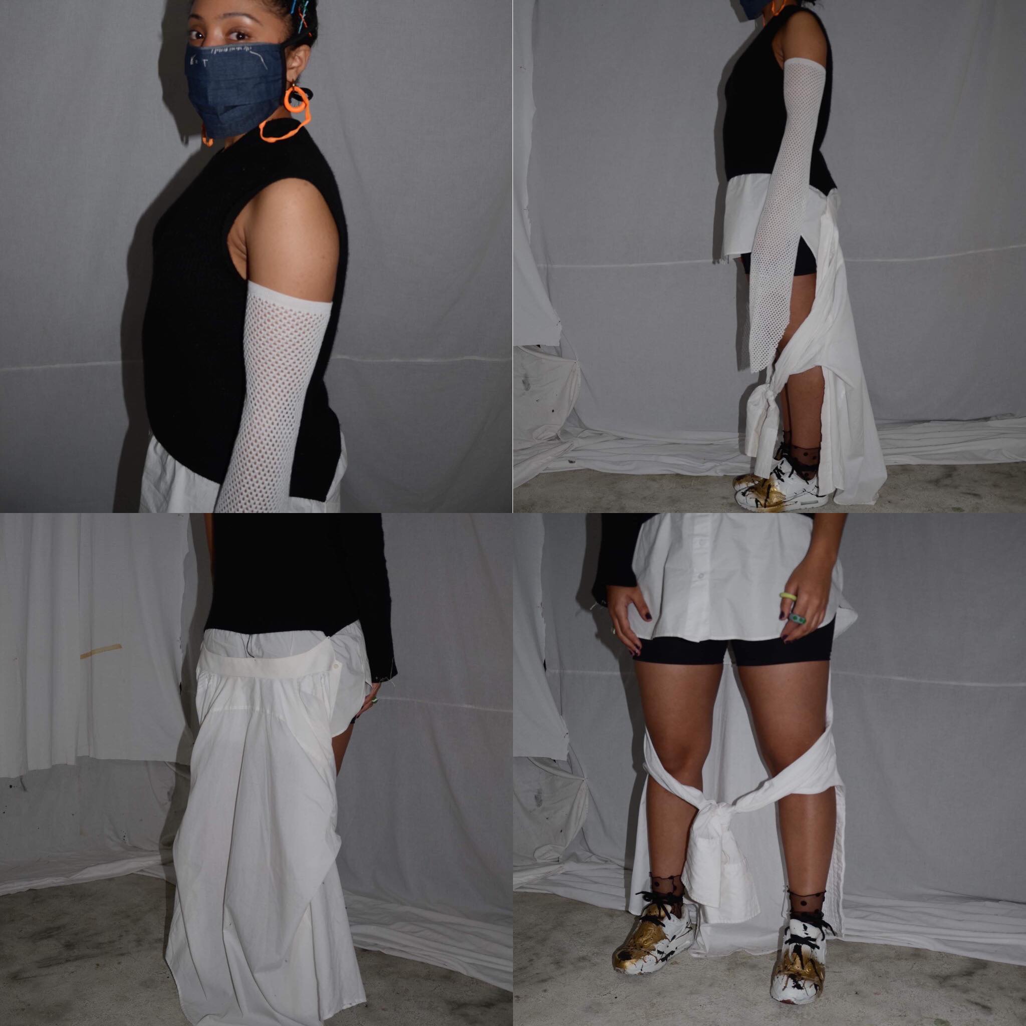 Liza: Vintage gloves, embroidery with thread from charity shops, different textures, knitwear, net, mesh, etc. Different types of stockings up-cycled to body-con crop tops, rough stitching, showing the hemming of clothing and expanding foam on the shoes.
