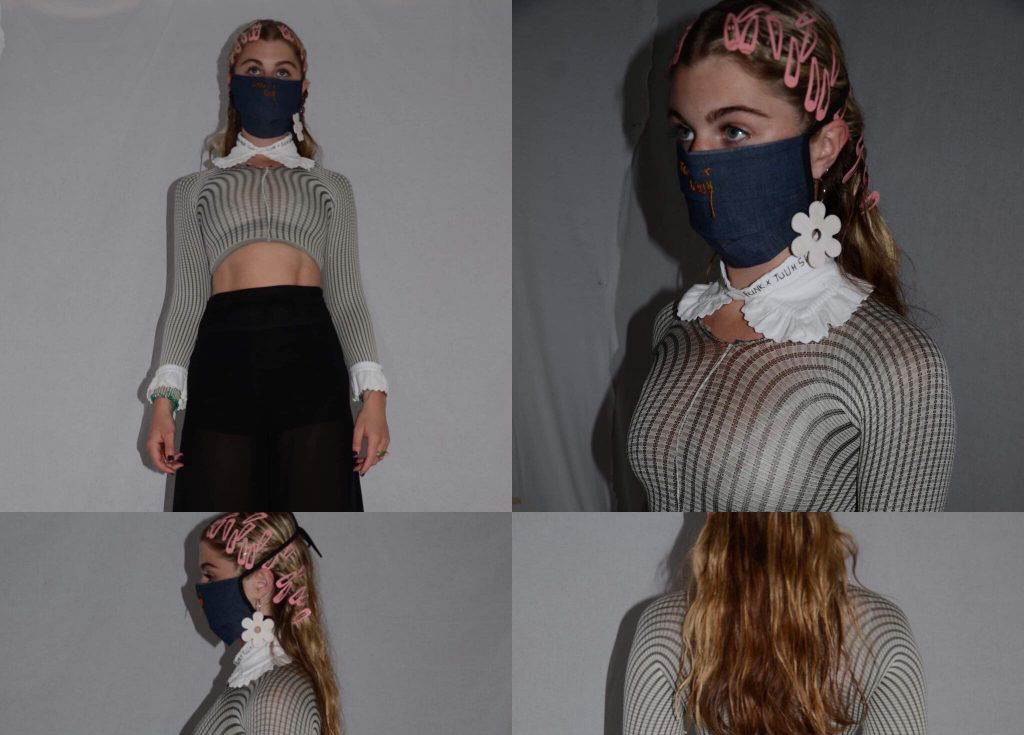 Liza: Vintage gloves, embroidery with thread from charity shops, different textures, knitwear, net, mesh, etc. Different types of stockings up-cycled to body-con crop tops, rough stitching, showing the hemming of clothing and expanding foam on the shoes.