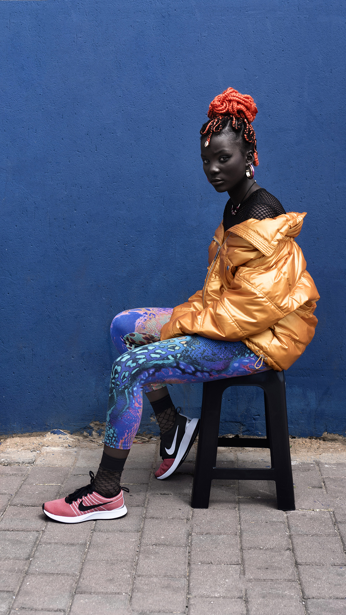Neon orange braids make reference to the 80s, but combined with the dangling cowrie shell above the models forehead, this editorial immediately places the Mariah and Dualtone Racer within an Afro-inspired relationship with 80s fashion. An orange snakeskin bodysuit, multicoloured leggings and dual tone cycling shorts not only play on the name of one of the sneakers, but also highlights the history of the shoe and the foundation of its design coming from being inspired by the 80s track.