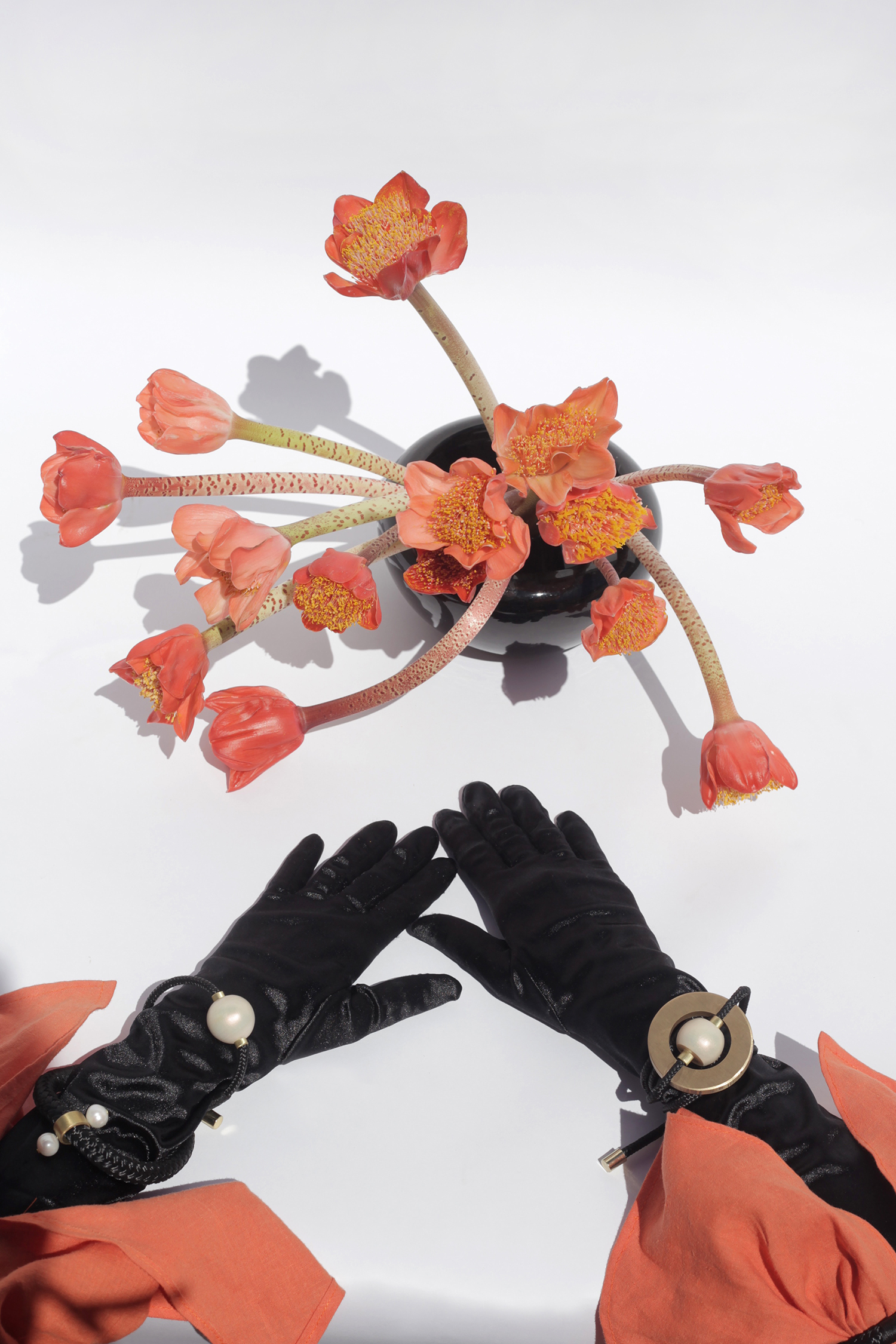 Looking at classic and non-traditional Ikebana arrangements, and referencing beautiful portraits of Ama pearl divers, the lookbook has a slightly cinematic feel, marrying ’80s opulence with Japanese minimalism. “[We wanted] you to feel as if you had gone on a journey or process of some kind,” Katherine-Mary explained. Contrasting elements were compiled together, with satin gloves and Ikebana arrangements alongside over the top embellishments. Shots by the ocean connect back to the influence of the ocean and create a dreamy, sci-fi feel.