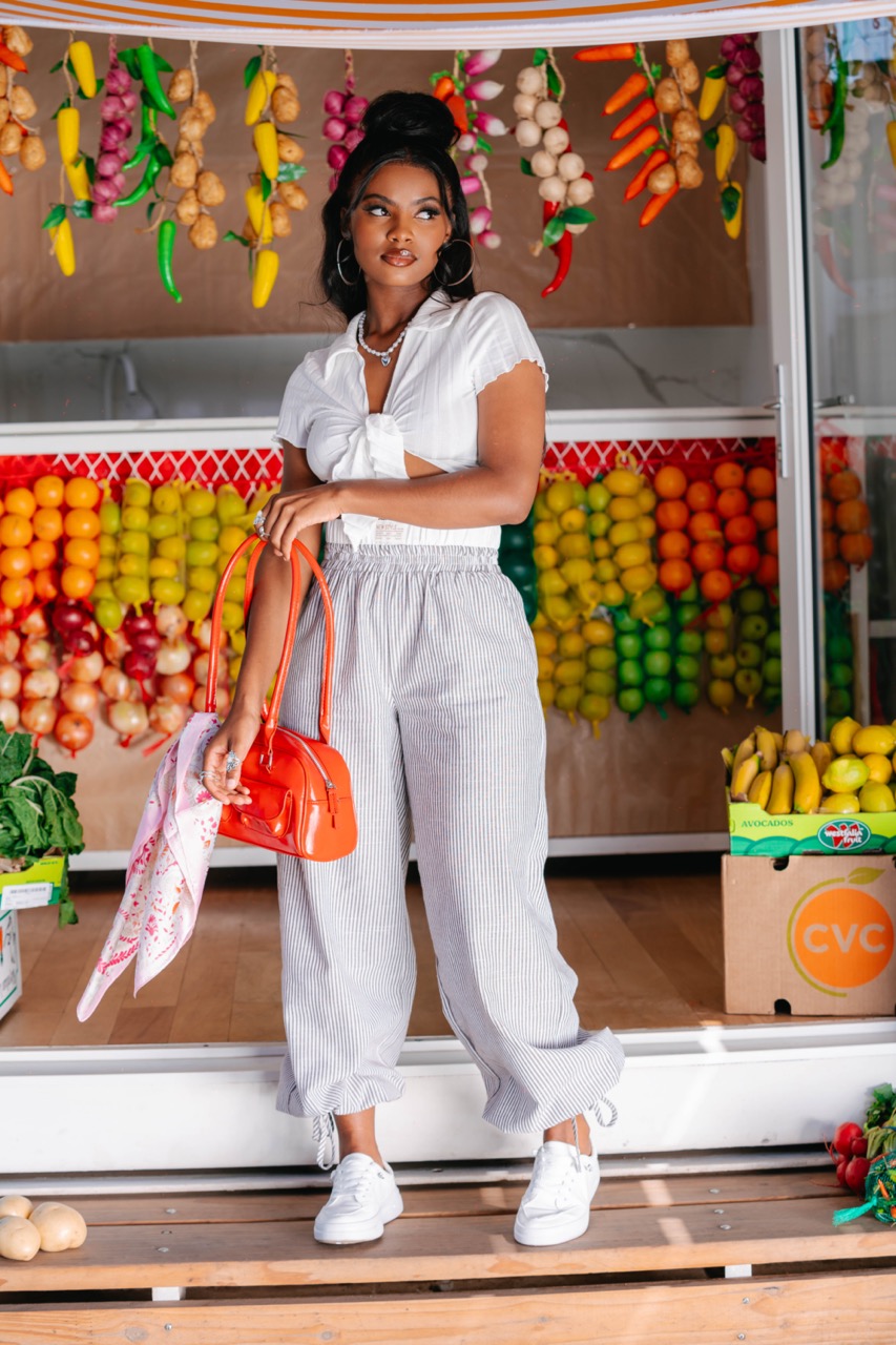 The second look is a street style staple – Bringing a laid-back edge, Sphokuhle’s second pick is all about attitude. She rocks a pair of loose, low-rise jean shorts paired with chunky Timberland-inspired boots and a bold football jersey. This look is effortlessly cool—perfect for when you want to keep it casual yet on-trend. The final look we got an exclusive sneak peak of was Vacation-Ready Chic – We’re swooning over this relaxed-fit pair of blue striped linen pants styled with a cropped, collared white tee. It’s giving major vacation vibes, whether you’re chilling at a beach bar or taking a stroll along the waterfront.
