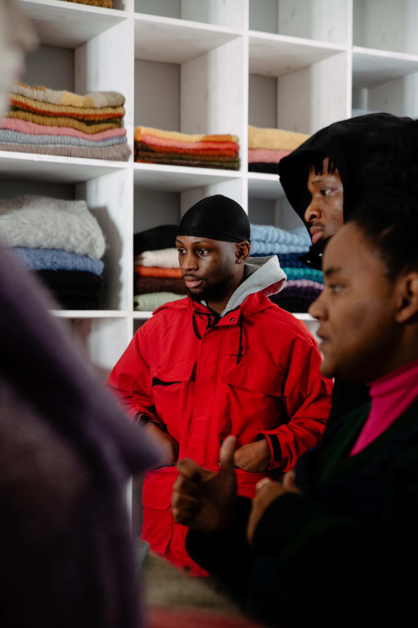 Following their time in the Karoo, the designers then met with the Ekasi Fashion Alliance, headed by Zuko Langeni, in Khayelitsha, Cape Town. Mbango and Morojele paired off, focusing on a combination of weaving and knitting techniques. Hlalethwa and Lassey decided on a mohair jacket in the shape of a shelter as a tribute to enslaved women in the 18th-century Cape. Their work was guided by mentors Ayanda Hans and Asanda Veco respectively showcasing True Fashion’s commitment to long-term growth and change.