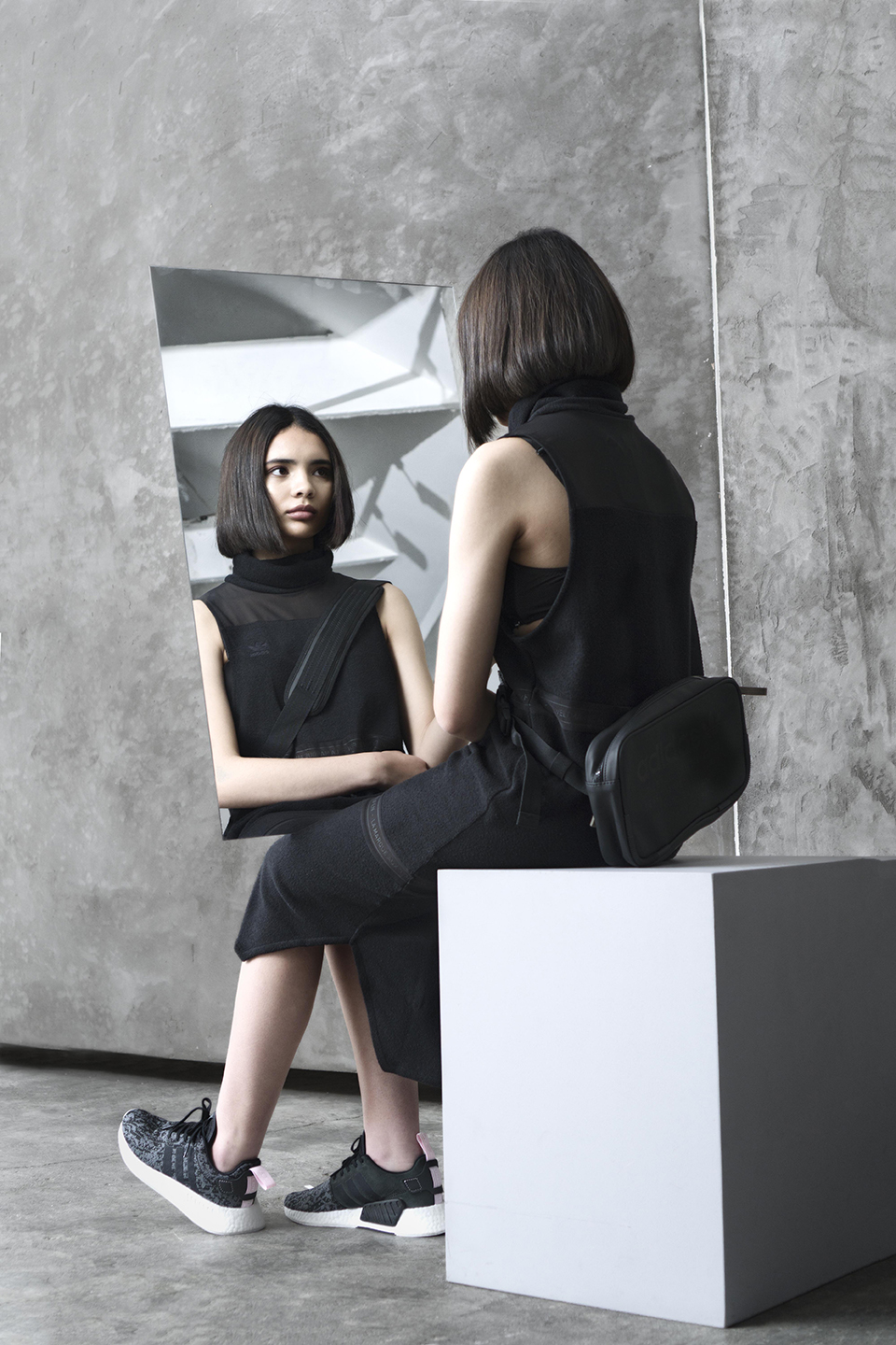 Playing on this, the use of a mirror articulates this exploration by creating two versions of the body; the body IRL and the body reflected in the mirror as the digital avatar. The mirrored image of the body wearing a VR headset highlights the futuristic and how technology has allowed for the coded versions of ourselves. This highlights the use of breakthrough technology to construct the NMD, which is still able to pay homage to the adidas Originals DNA.