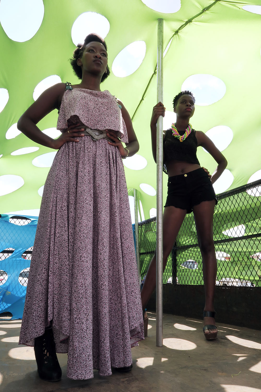 Mapungubwe street was blocked off for the event, with two white twin-pole tents running about a hundred metres down the street. Green astroturf was draped over a low platform and flowed onto the runway. A red carpet was laid along the length of the runway and was flanked on either side by black plastic chairs. Where the chairs ended a row of centre-fold tables (also on either side of the runway) continued along the road marking out a second part of the runway intended for designers to exhibit and sell their show pieces directly after the shows when the event transformed into a pop up market.
