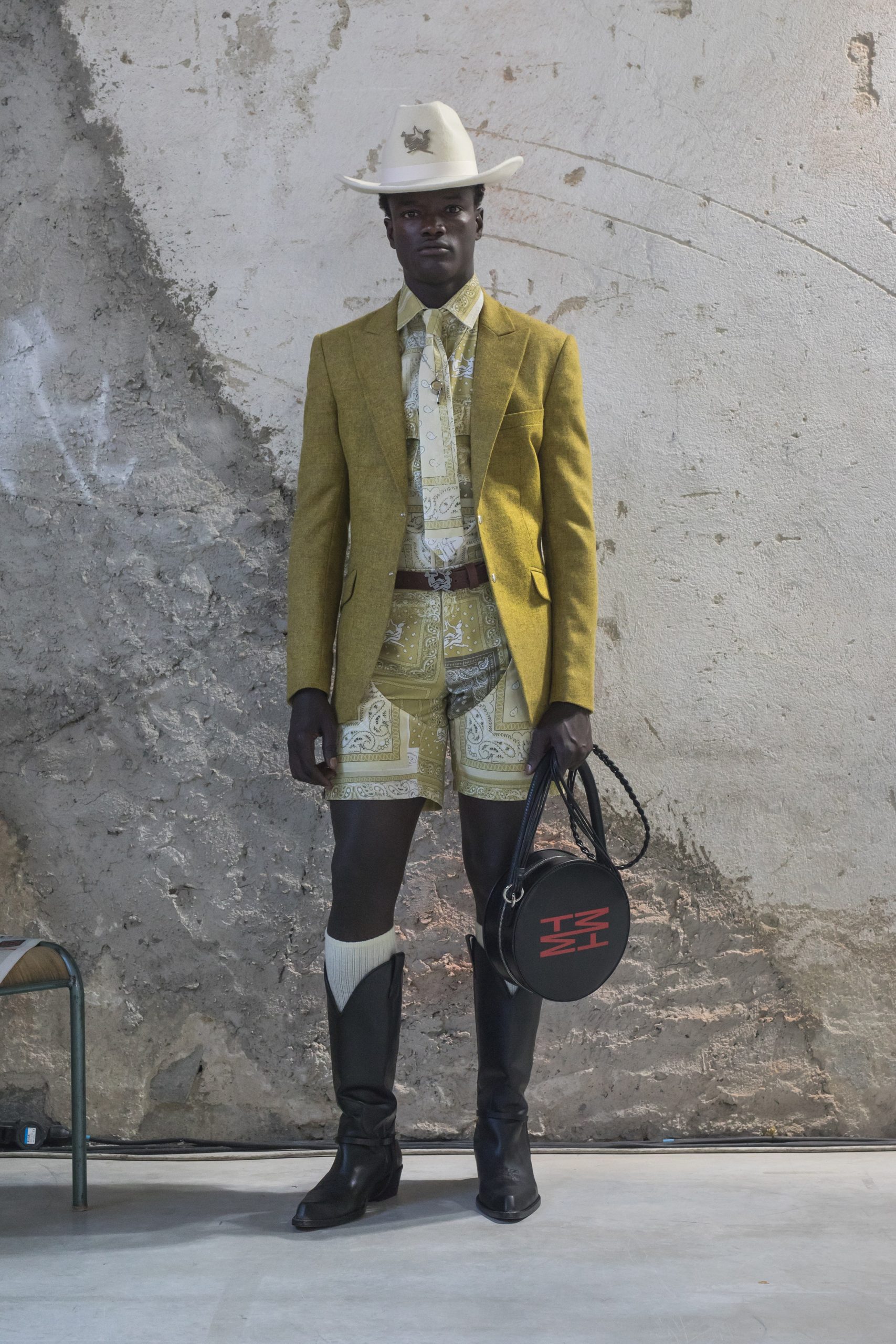 Bashimane a bosigo, which is a Setswana translation for his collections Ultimate Midnite Cowboys wore cowboy themed Thebe Magugu attire – including staple items such as tailored two-piece suits, trench coats accessorised with colourful cowboy hats, ponchos, bags, belts and boots emblazoned with the official Thebe Magugu “Sisterhood emblem”. With this collection, the devil really seems to be within the detail – with Magugu providing an interesting spin on the traditional western cowboy bandana print. The pattern is reworked to include the sisterhood emblem and to suit the colour pallet of the collection – another example of Magugu utilising familiar African motifs to re-interpret heritage westernised blueprints, opening up another dialogue surrounding the dichotomy which the contrast creates.