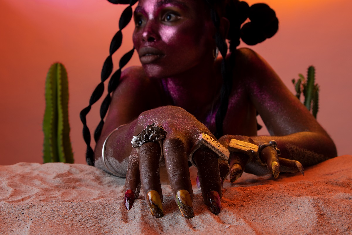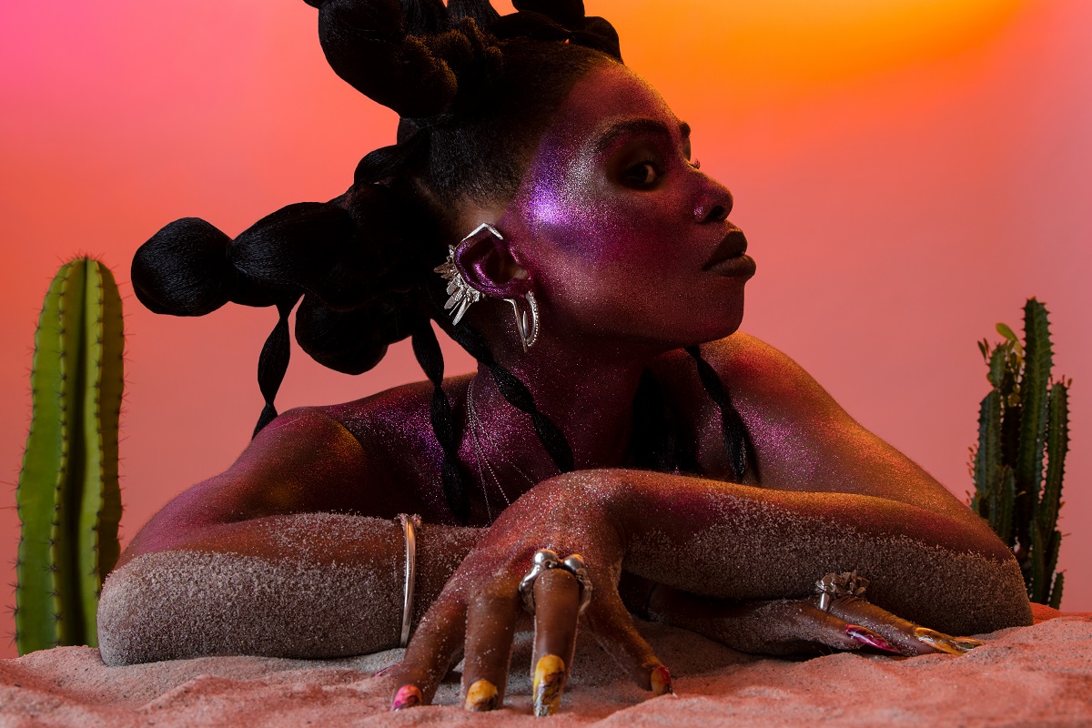 South Africa’s jewellery industry has long leaned towards a ‘classic’ design aesthetic that tends to compartmentalise aesthetics through gender, however, today those separating lines have become increasingly more blurred as people embrace — more and more — the fact that gender is a construct and thing we can put down, flip and reverse at will. Fluidity expands the imagination, therefore, this has also granted creatives the space to experiment more through innovative design. Landing is Tshepiso Jewellery’s latest editorial campaign shot by Cape Town-based Anthony Hinrichsen (Creative Director) and Armand Dicker (Photographer). As a team, they translated their interest in the otherworldly and uniquely beautiful into images of muse Yongama Mgqibela in Landing — capturing the distinct spirit of the jewellery design house. Tshepiso’s process often consists of building up and stripping down work, to reach a delicate balance of weight and shape.”