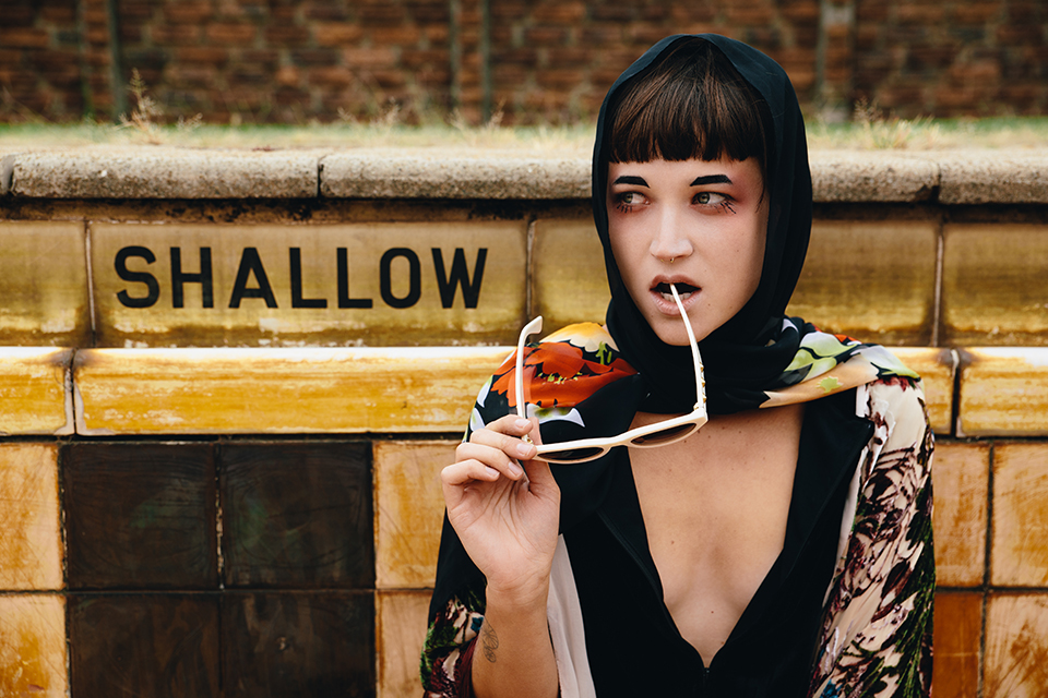 For her cover feature with BubblegumClub Lenny-Dee Doucha, the lead singer and keyboardist of Bye Beneco, wanted to mix the contemporary and the traditional. Photographed by Charlemagne Oliver at the National School of Arts Campus in Braamfontein, the concept was to merge Art Deco and Japanese motifs. The Art Deco style speaks to glamorous modernism with a focus on precise design and elegant geometry. The photographs convey this through Lenny’s subtly glamorous accoutrements- the snow white sunglasses, the stem of the cocktail glass. This is complemented by her floral shawl and scarf, which hint at the Japanese influence. Flowers have a particular importance in Japanese aesthetics, with their rich pallet of colours conveying a powerful spectrum of emotion.
