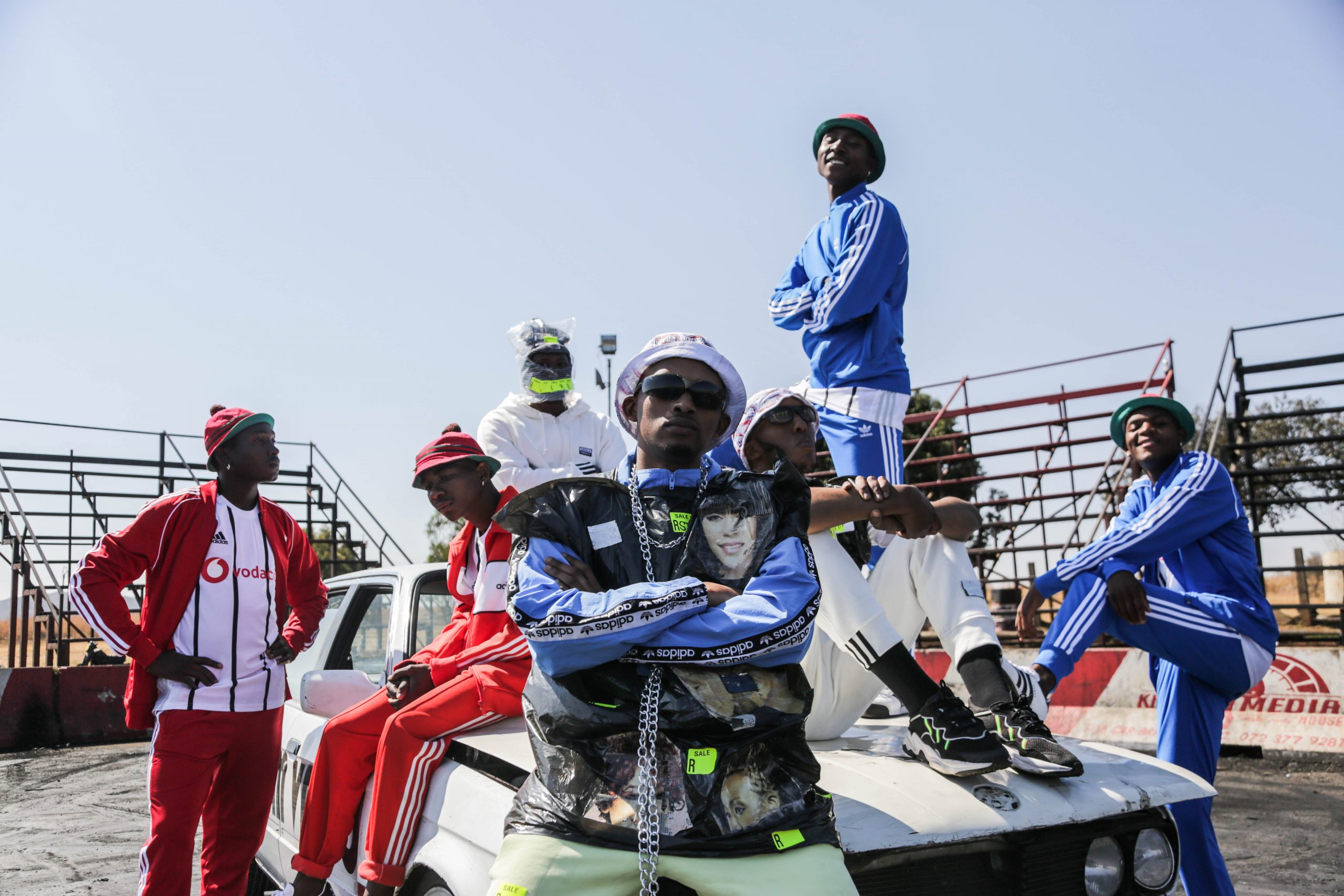 Witnessing Mkokotelo’s visual language of necessary reinvention feels like jamming out in a space of liminality “when the past has lost its grip and the future has not yet taken definite shape” (Turner 1992: 133). I think of Chicana feminist Gloria Anzaldúa’s theory of Nepantla which she defines as “a space between two bodies of water, the space between two worlds. It is a limited space, a space where you are not this or that but where you are changing. You haven’t got into the new identity yet and haven’t left the old identity behind either—you are in a kind of transition”. While the past is important as a source from which to draw knowledge and inspiration, it also has its suffocating limitations. So we as artists and a yawning, stretching generation rebel, daydream, play and create. Thus fashioning new possibilities through boundless self-configuration, chaos and disruptive re-imagination. This is what Stiff Pap offer to us with their new video. With its Pantsula dancers clad in adidas fits, playful joyfulness, its apocalyptic costuming and track marks from the Ghosts of Gusheshes past, they have fabricated in Mkokotelo a world that is rooted in several histories, yet is in no way restricted by them.