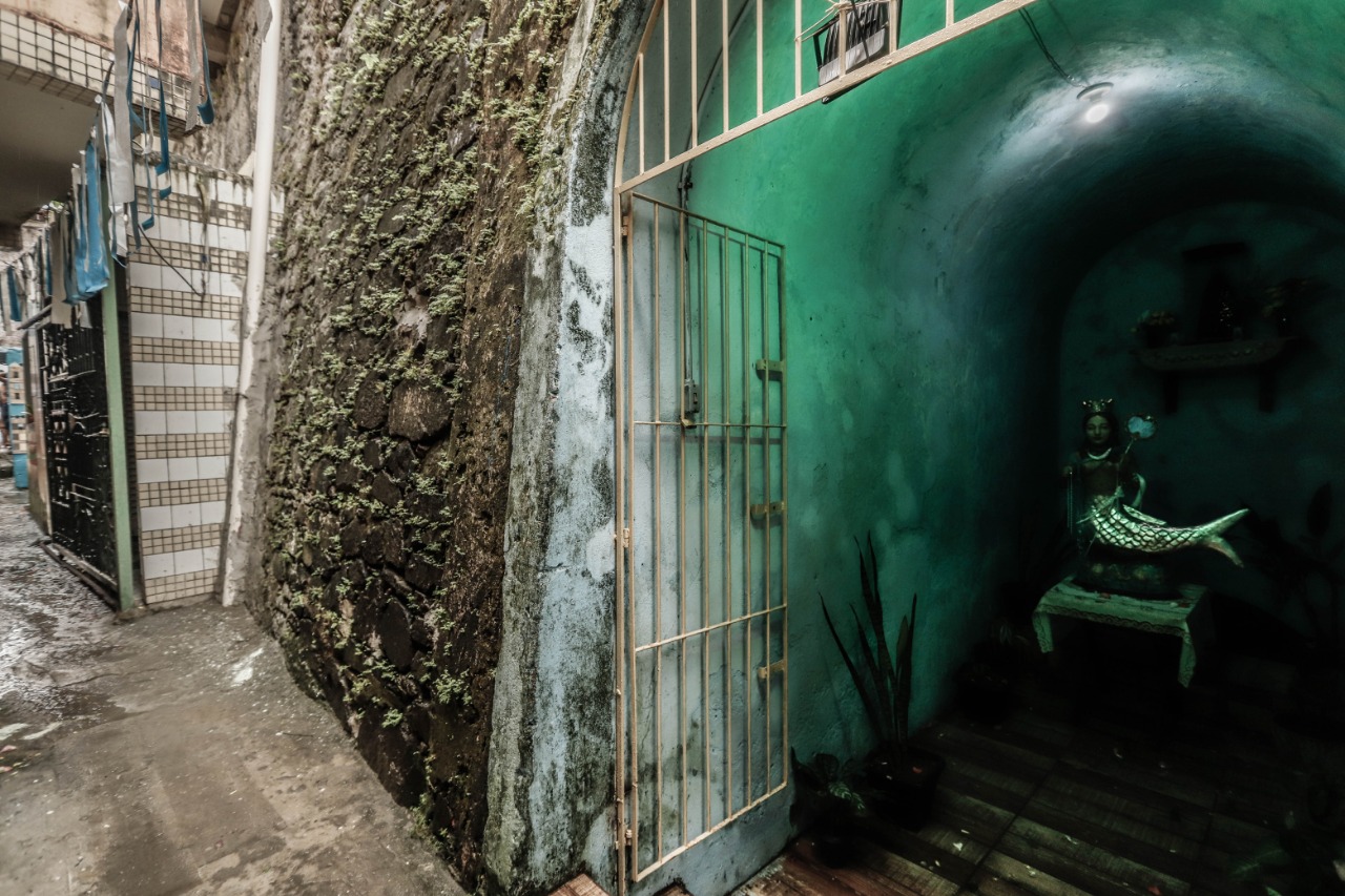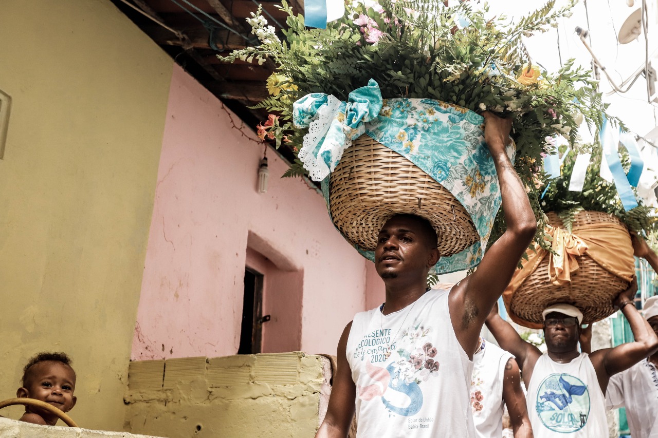 A good example of a party that took me away was the Ecological Gift of the Community of Solar do Unhão held by the residents and fishermen in gratitude to Yemanjá. The party takes place in the alleys of the Solar that are very narrow and that accommodate the parade, residents, arabesques, photographers, children, flowers, lavender, visitors, and much faith. In other words, it is almost impossible to photograph [anything] — especially if it is raining — as it was this year. For the whole work, I ended up giving up insisting on photographing still in the first third of the way and I understood that it would also be very good to continue with a procession singing songs in salute to Yabá, which is part of my religious journey. And it was incredible to live that with all those people who didn’t know each other and seemed so intimate because they were talking about the same thing in those moments. This greatly reduced the anxiety to photograph, which became a secondary action. In the end, I ended up taking 4 or 5 photos, from comfortable situations that arose on the way and they were pretty cool because they translated everything I could feel at that party.