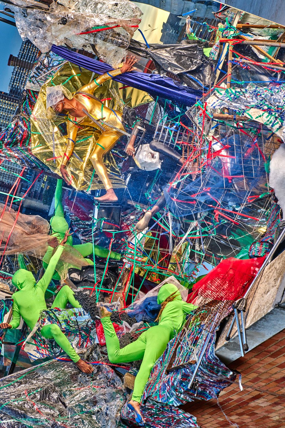 Pastel dreams contained in layered lines articulate a juxtaposition of planes. Disconnected and monumental. Urban relics. Steel exoskeletons encase prickly plastic forms. “Creating objects that exist ambiguously, like glitches.”. Establishing a linear progression – a climactic moment ruptures at the end of the hallway in a series of dystopian Neoclassical Epics entitled, Promises of the City. The five photographic prints explore a narrative sequence nested in visual illusion. Chroma Key figures engage on a set of entropy. The collaborative effort constructed on the rooftop of August House references Modernist architecture characteristic of the city.